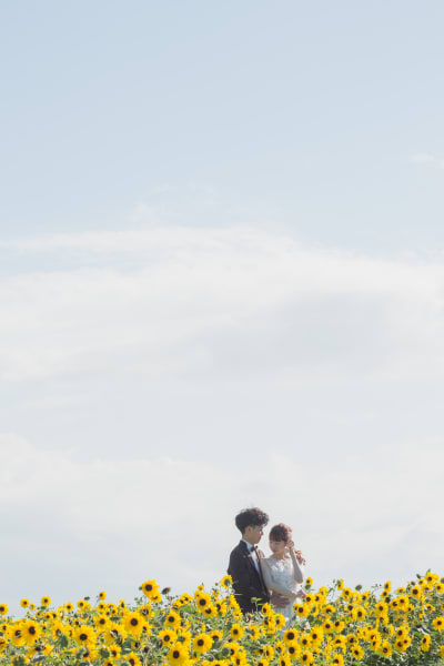 ひまわりの黄色と青空とウエディングドレスの白がしっかりマッチしていて