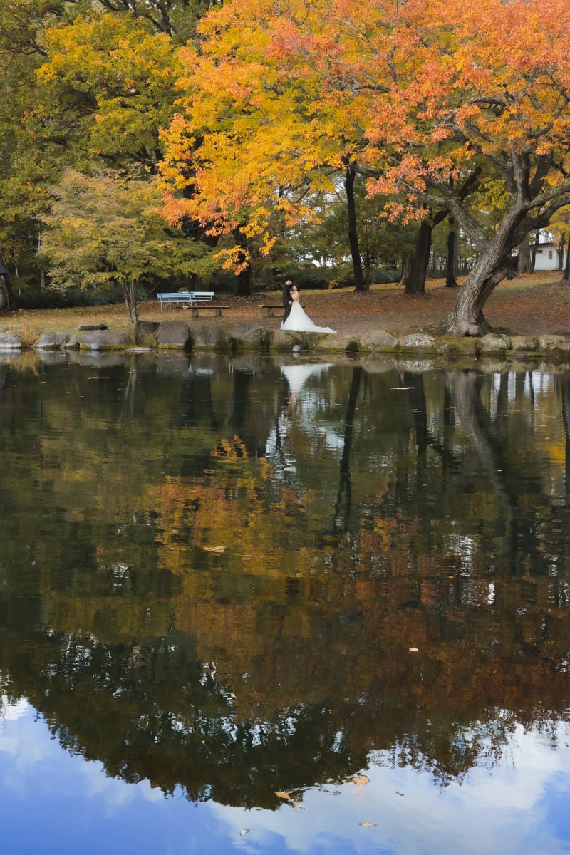 カラードレス・ウエディングドレスどちらでも可愛く撮影できる紅葉は秋のロケーションの大目玉ですよ♪