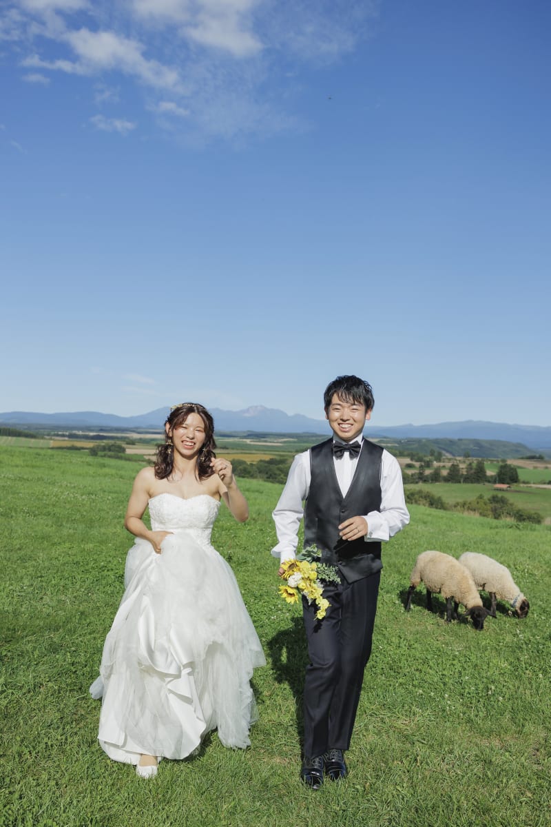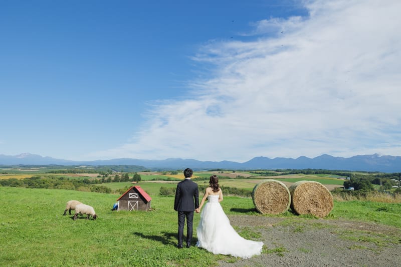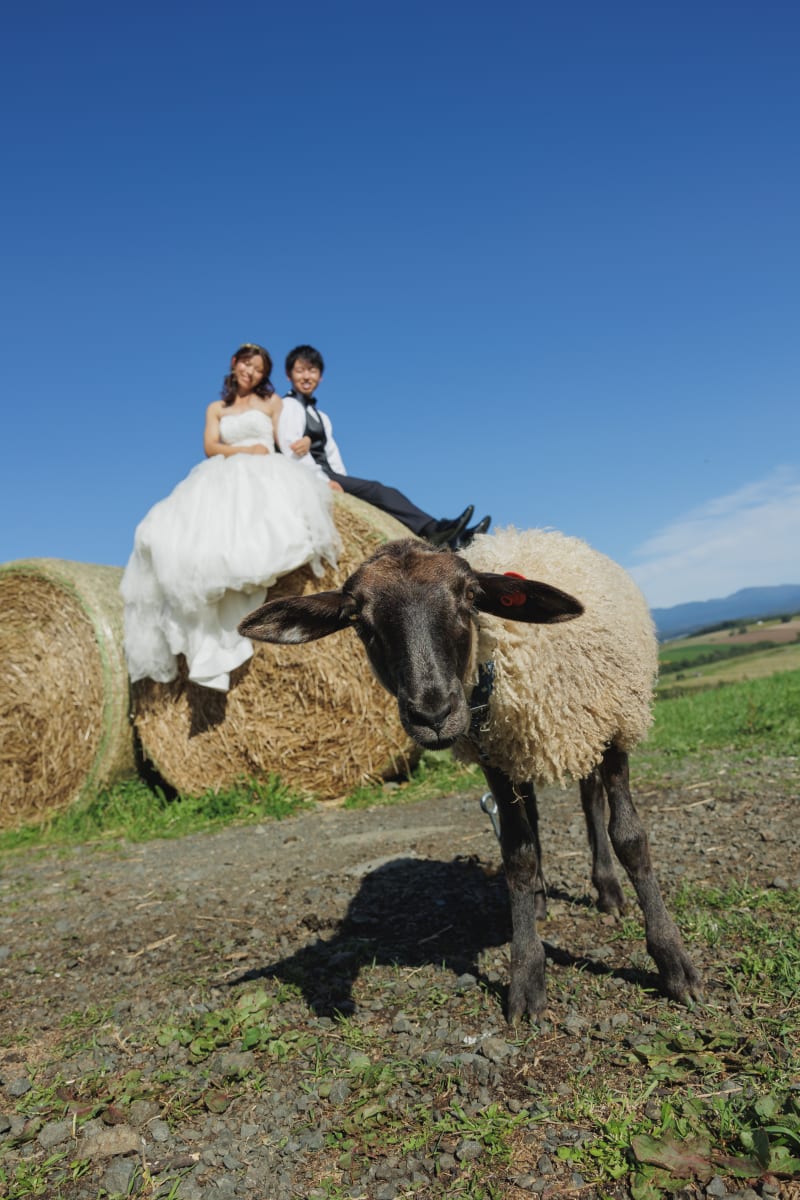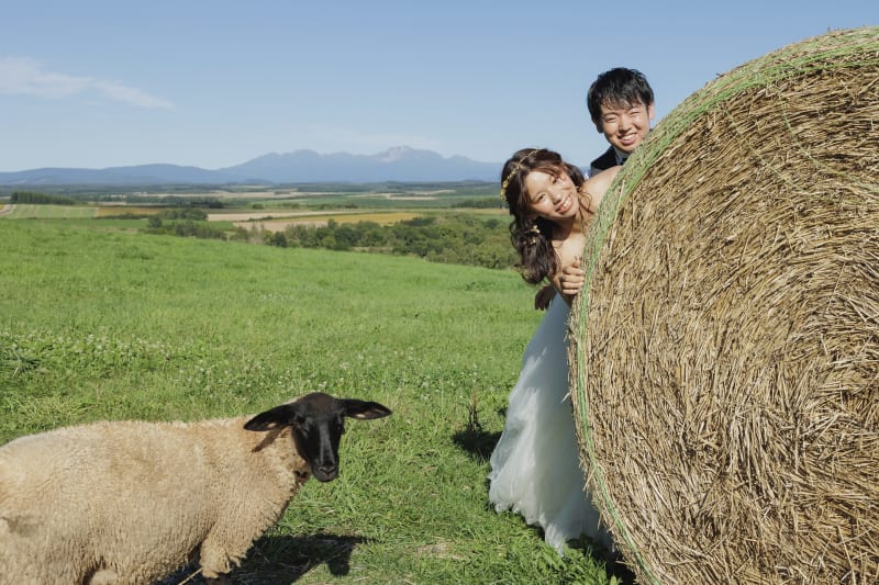 美瑛の景色を望められる丘の上にある「ファームズ千代田」では、牧草ロールや羊さんと一緒に撮影が楽しめます♪