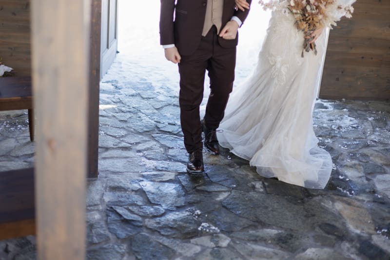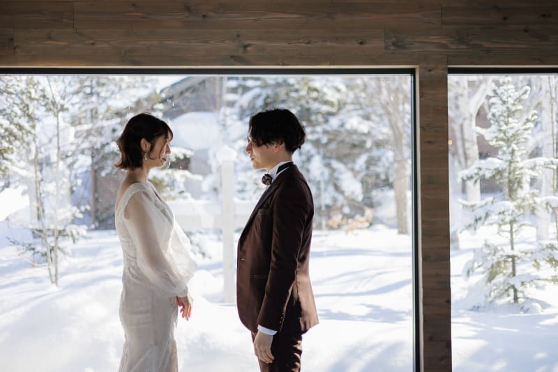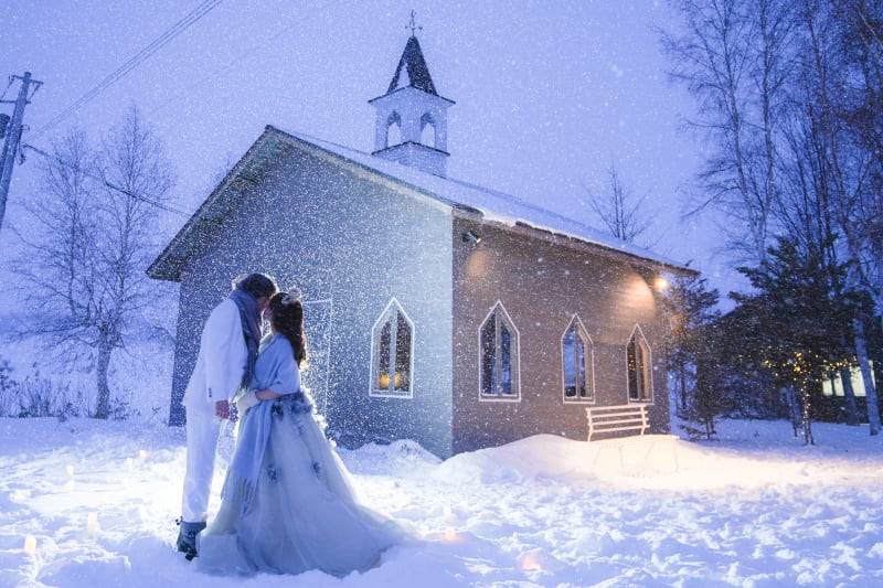 結びにチャペルの外で雪が降る中で幻想的なお写真を