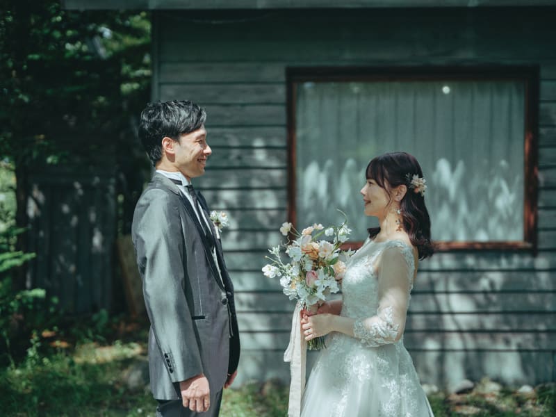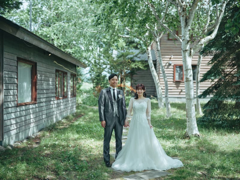 ご新婦様のドレスは新緑の景色に一層の華を添え、ご新郎様の衣装も見事に調和し、お二人の穏やかな雰囲気が写真全体に暖かさをもたらしました。