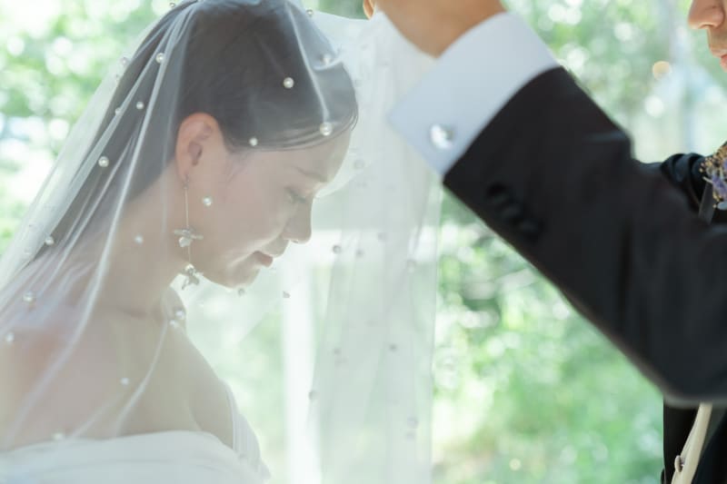 人前式風なベールアップの瞬間も美しく!後ろの新緑がご新婦様の美しさをより一層輝かせています✨