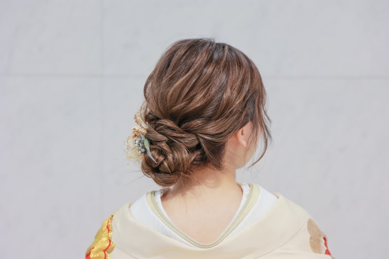 新婦様のヘアスタイルはシニヨンスタイルでご希望いただきました! 髪飾りにはドライフラワーの髪飾りで華やかに!!