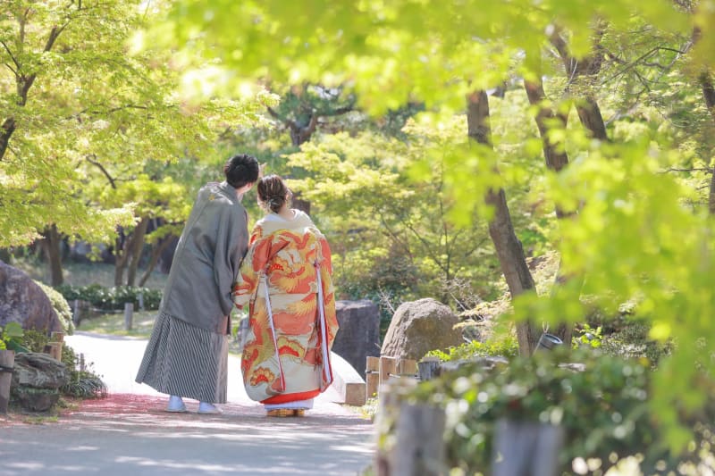 新緑の中におふたりのお衣装もとっても映えて素敵でした!