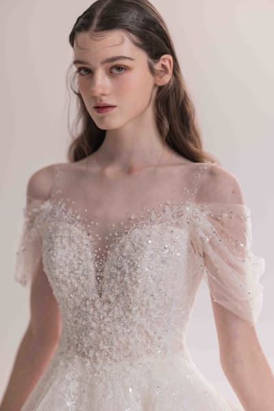 重さを感じさせないチュール素材のオフショルダーが可憐で上品な印象を与えます。