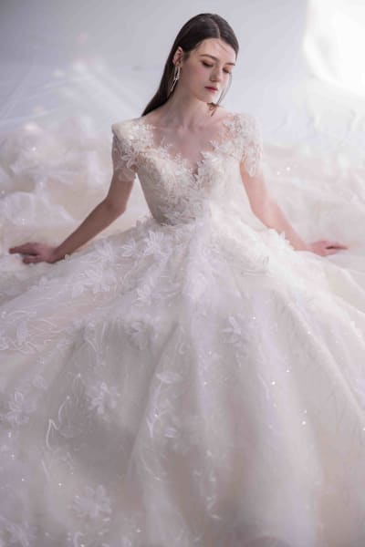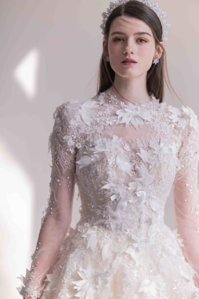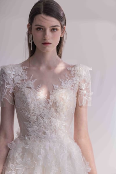 素肌に纏うように施されたハンドビーディングと奥深い3Dフラワーが可憐でヌーディ感を演出。