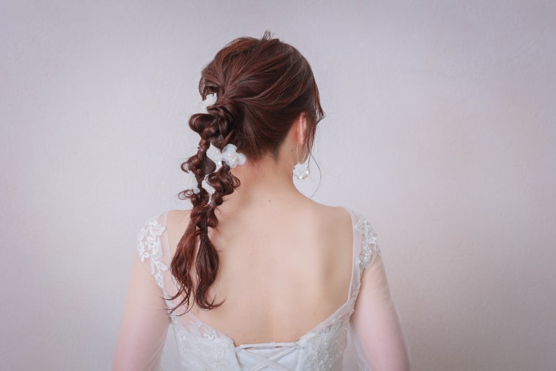 新婦様のヘアスタイルはツインの編み下ろしをご希望いただきどの角度からみても動きのあるスタイルでとっても可愛かったです✨
