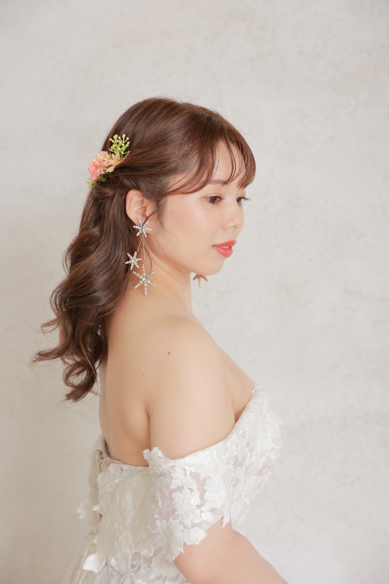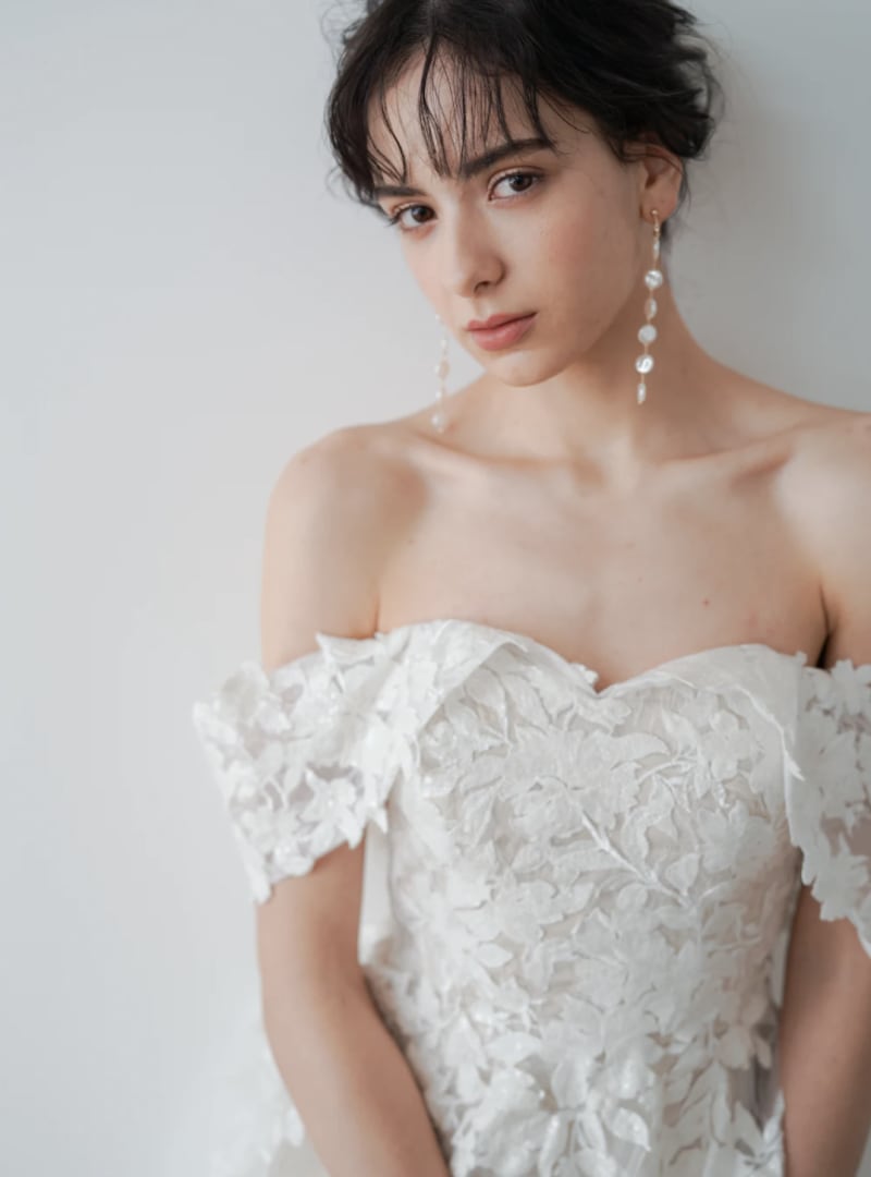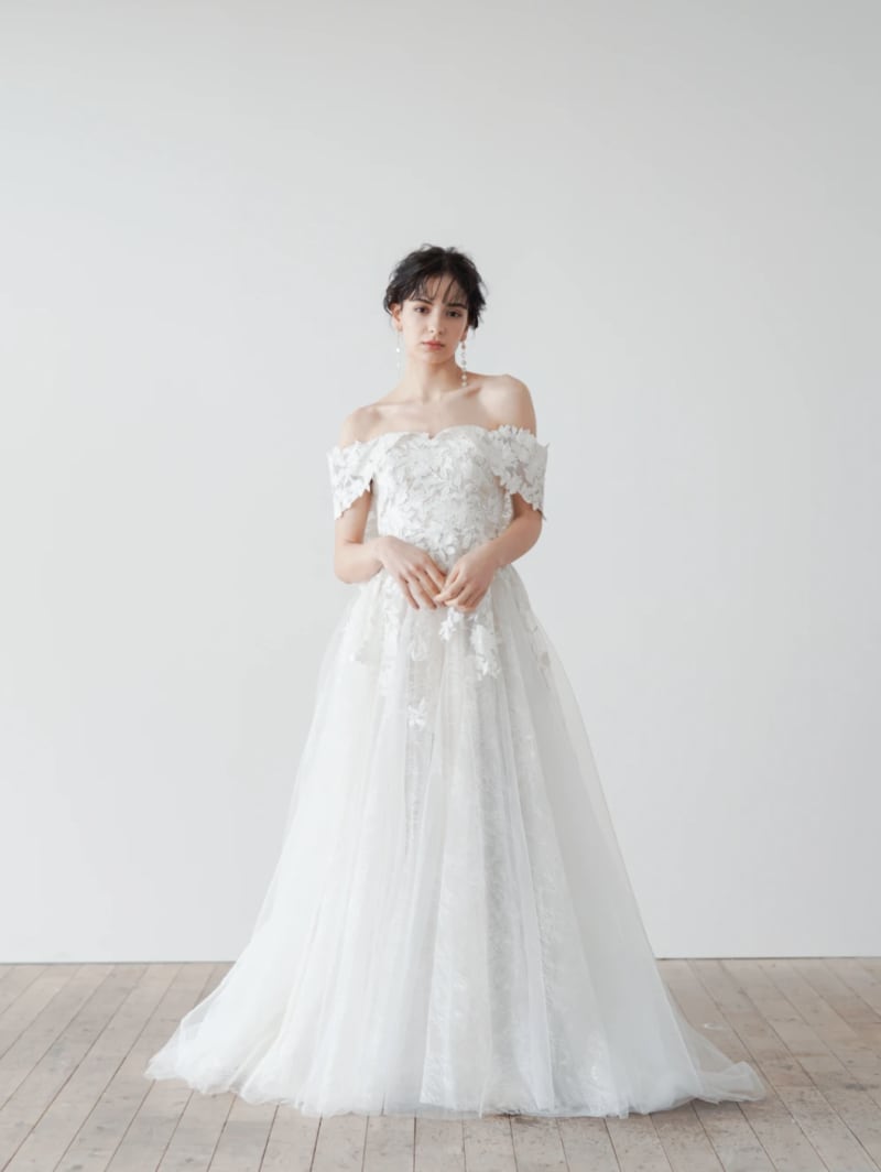 優しいアイボリーが絶妙な白色で肌馴染みがよく、オフショルダーが大人花嫁を演出します。