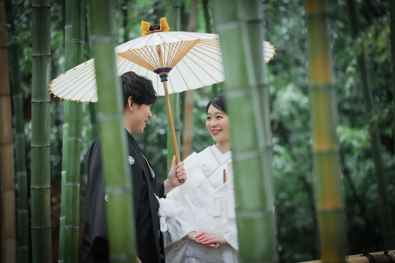 竹が風に揺れる音や竹の間から差し込む柔らかい日差しの美しさが、心安らぐひとときを演出し、おふたりの魅力をさらに引き立ててくれます。