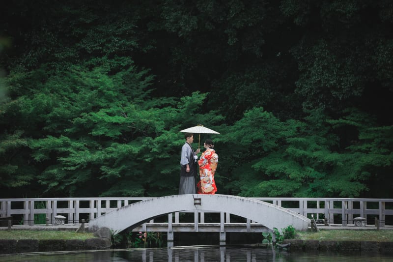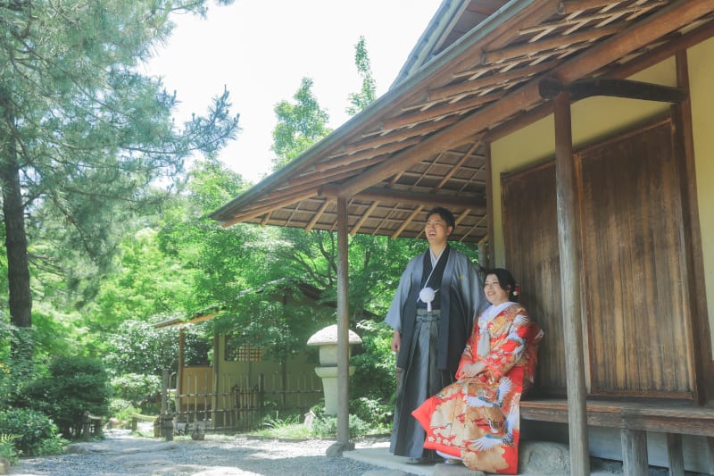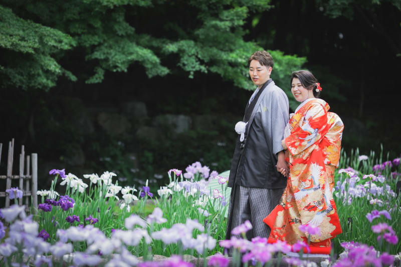 徳川園では四季に合わせてさまざまなお花が咲いています。 今回は撮影が6月ということもあり花菖蒲と一緒に。