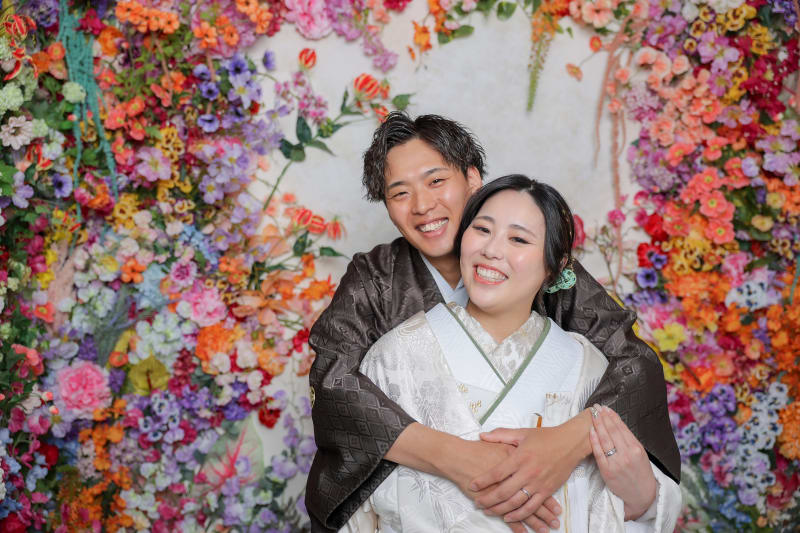華やかなお花を前にお二人の笑顔が輝いていてとても素敵です^^