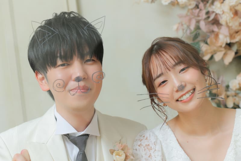 お互いの顔に猫のラクガキをしたアクリル板を持って、、、