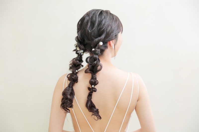 洋装では先ほどのルーズシニヨンを解いてツイン編み下ろしに!!