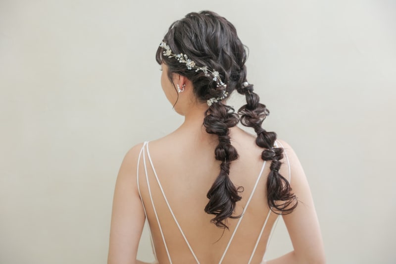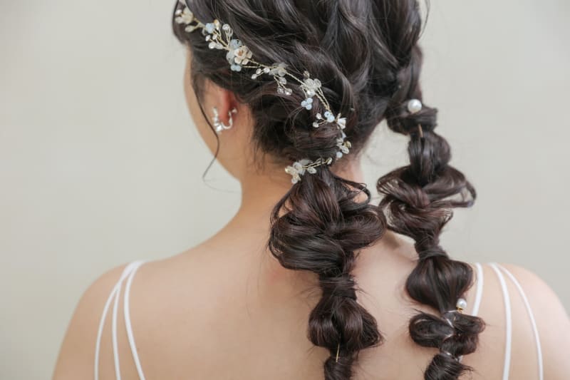 ヘア飾りは長めのビシューアクセを使用し、網下ろしに巻き付けました!