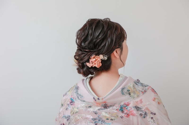 ヘア飾りはドライフラワーを使用して髪型のふわっと感に合わせたより可愛いスタイルとなっております!