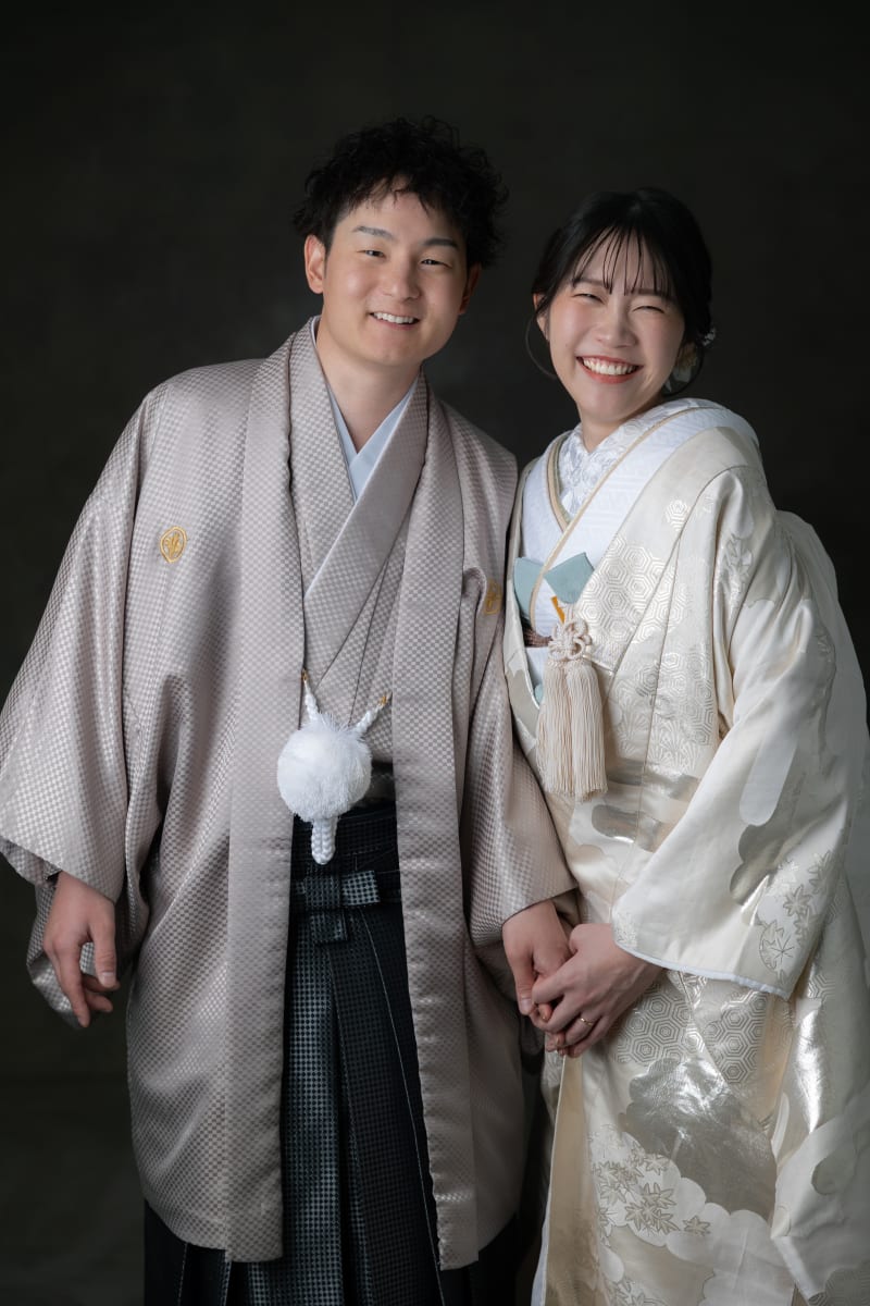白無垢をお召しになられた新婦様とグレー袴をお召しになられた新郎様です。