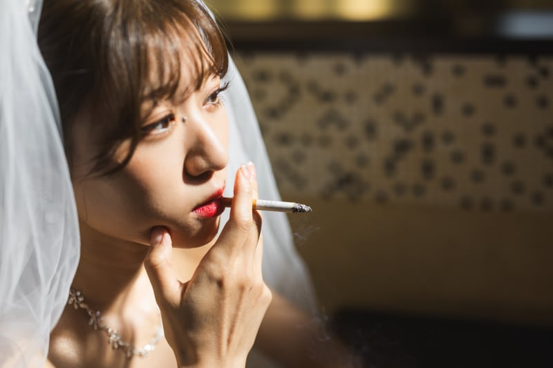 赤リップ×ドレス×タバコという