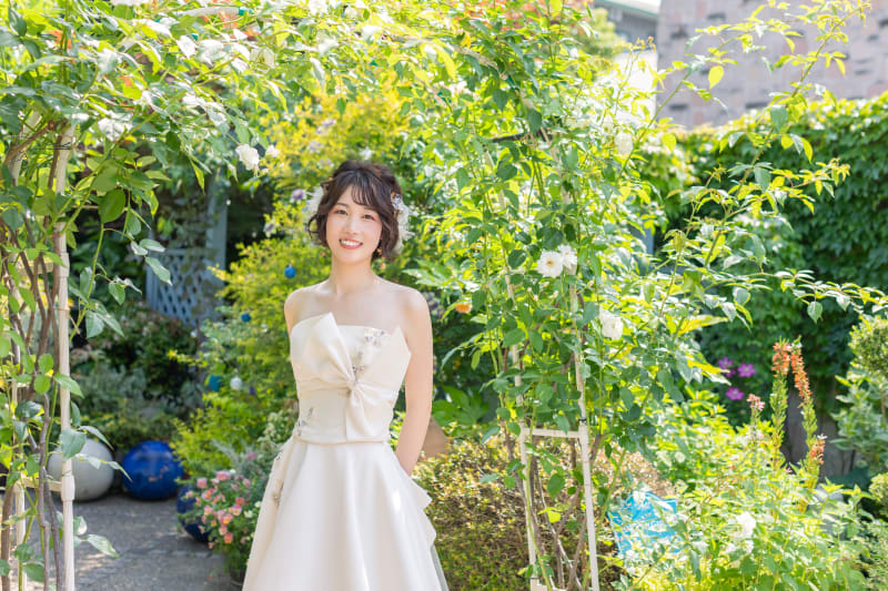 ウェディングドレスに合わせたスタイルは、ショートボブの自然なカールを活かして柔らかい印象に。