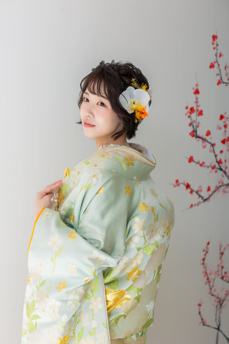 落ち着いた色味の色打掛に合わせた、ふんわりボリューム感のあるショートスタイル。