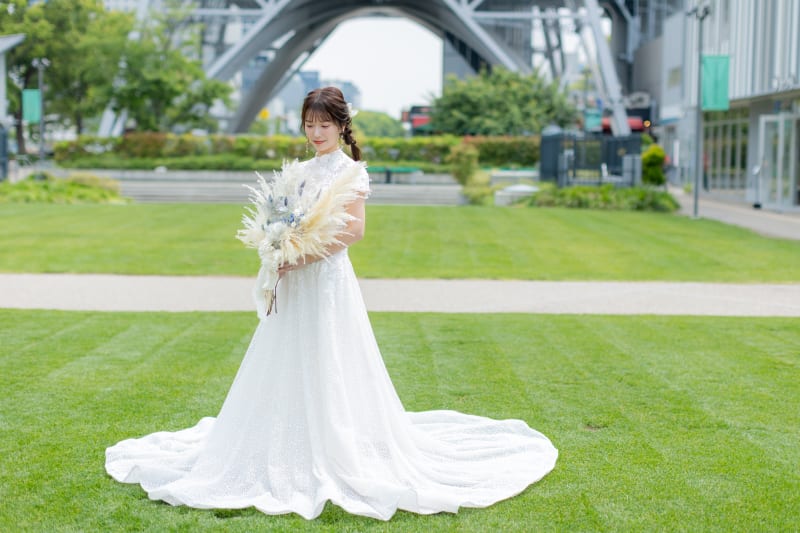 風になびくトレーンや、ブーケを持つ姿がロマンチックで、見ている私も幸せな気持ちに。