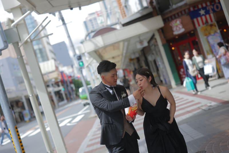 賑やかな背景やカラフルな街並みと一緒に、笑顔あふれる写真が残せます。食べ歩き風のカットも魅力的♪