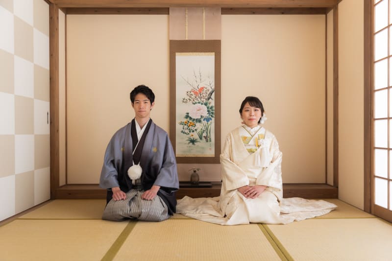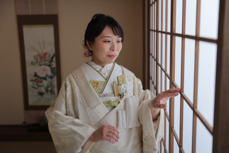 室内の和空間での撮影にもよく合い、落ち着きと華やかさを併せ持つ装いです。