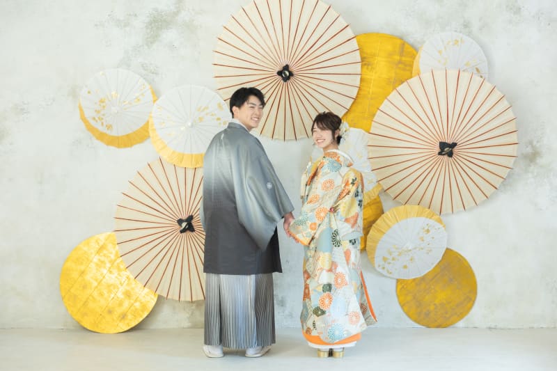 水色をベースに、オレンジや金色の菊がぱっと映えるため、写真映え抜群。明るく朗らかな雰囲気の花嫁さまや華やかに魅せたい方にぴったりです。