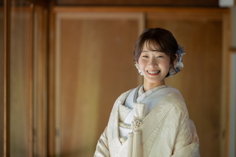 生成りの白無垢は、真っ白よりも柔らかく、女性らしい印象を引き立ててくれる人気の一着。