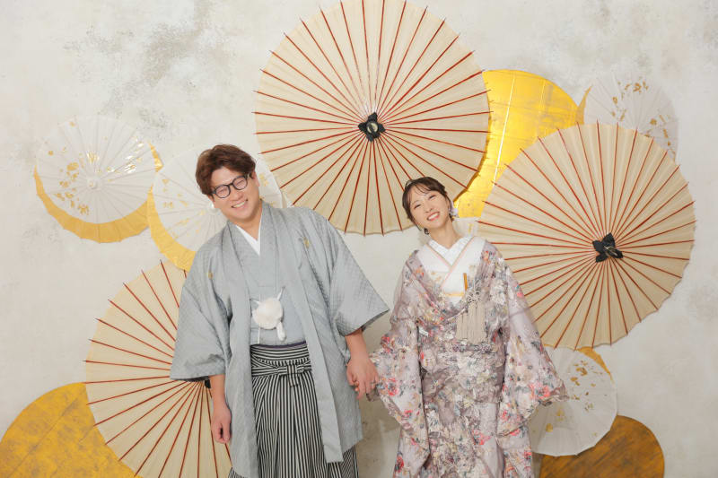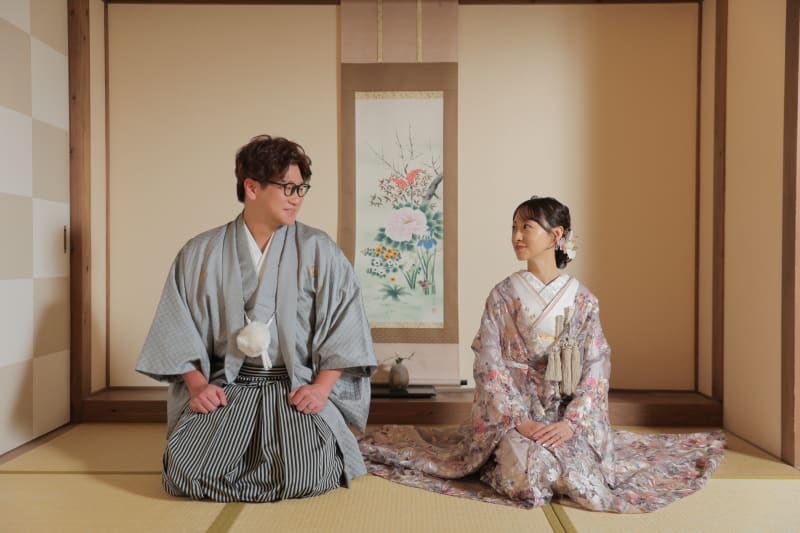 グレーの紋付袴と並ぶと、全体のトーンがまとまり、より洗練された印象に。