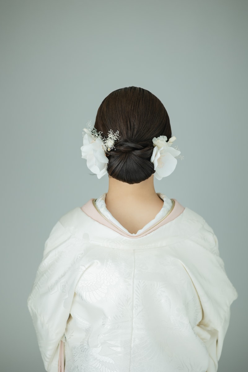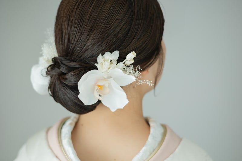 また、掛下のコーディネートに合わせ髪飾りにほんのりピンク色が入った胡蝶蘭をおつけさせていただきました。