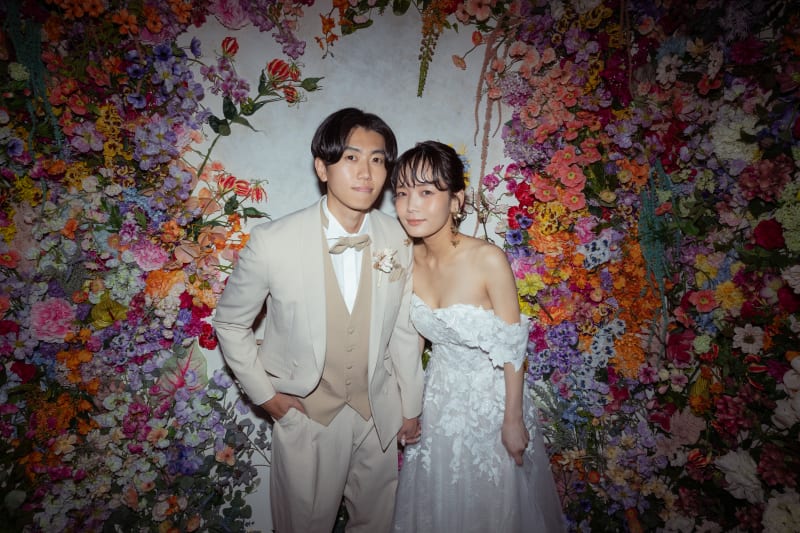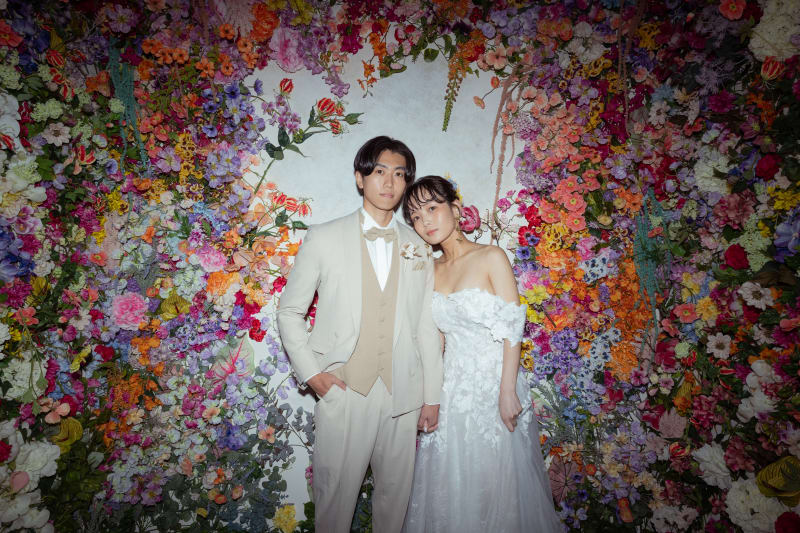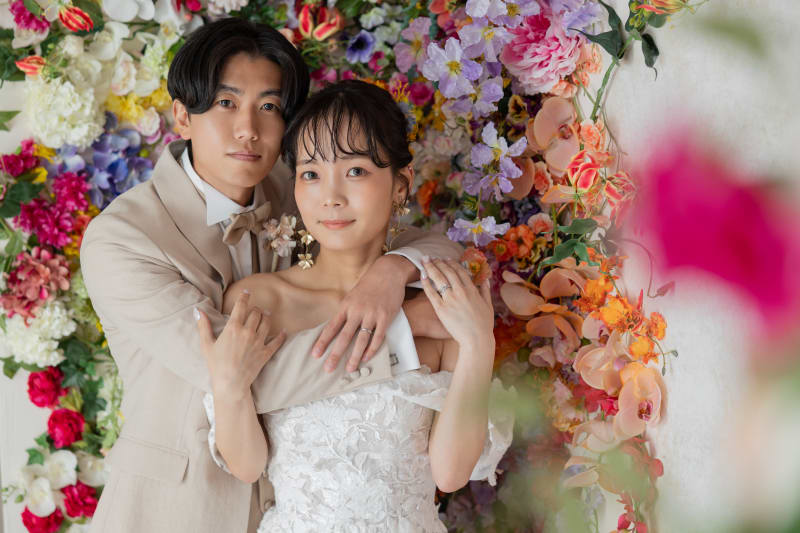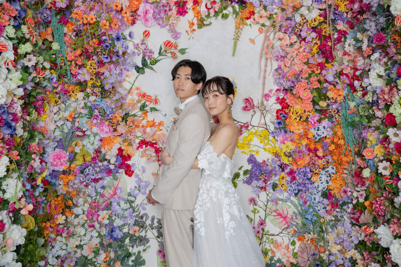 壁一面に広がるカラフルなお花を背景に、華やかでロマンチックな撮影を行いました。