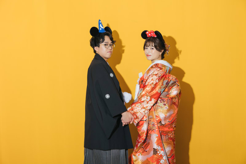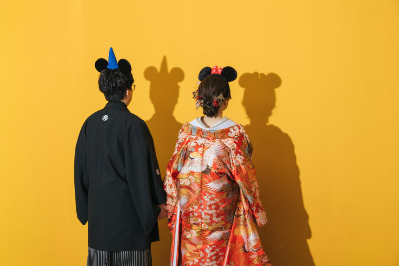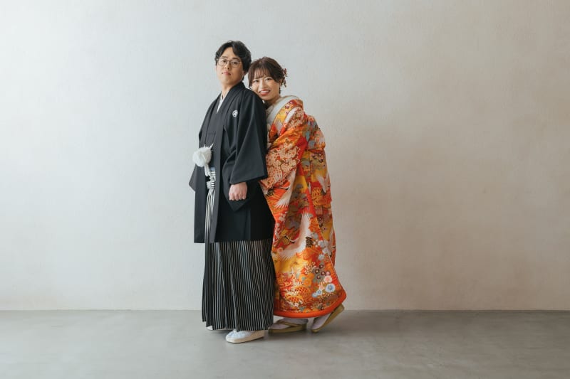 赤の色打掛と黒の紋服の組み合わせがとても映える
