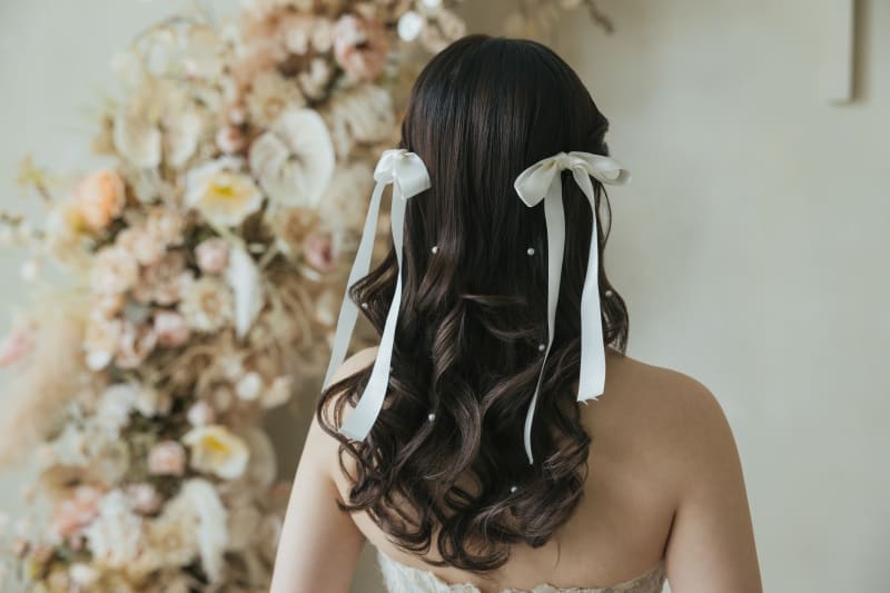 ふんわりまとめた髪にリボンをプラスすることで、可愛らしさがぐっと引き立ちます。