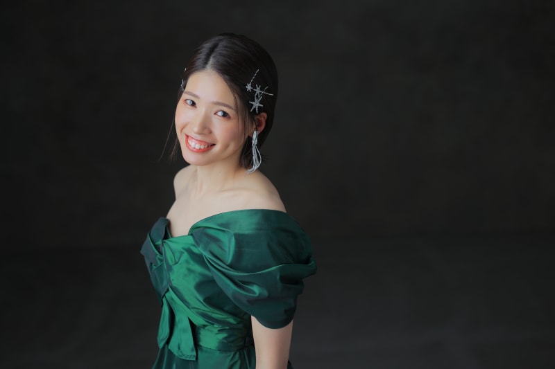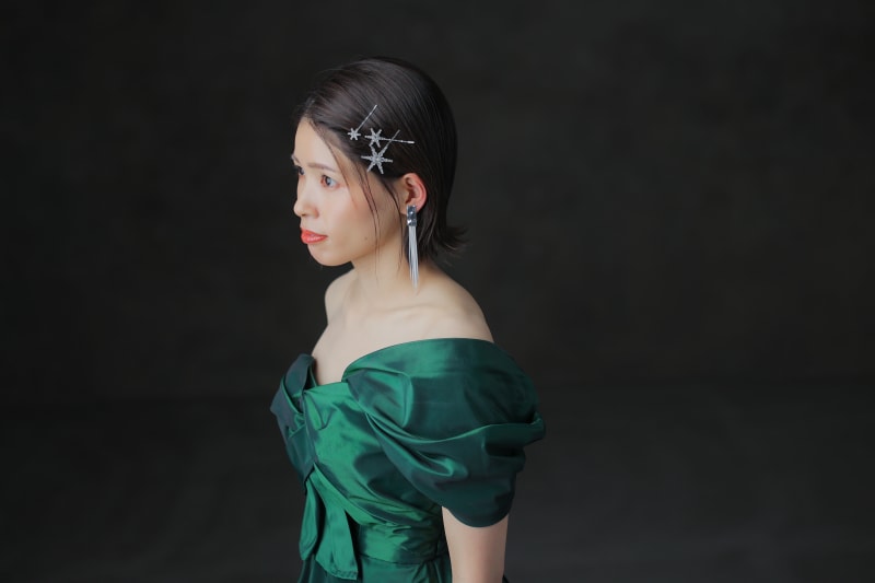 対してカラードレスでは、タイトにまとめたスタイルで一気に洗練された大人っぽい雰囲気へと変化します。