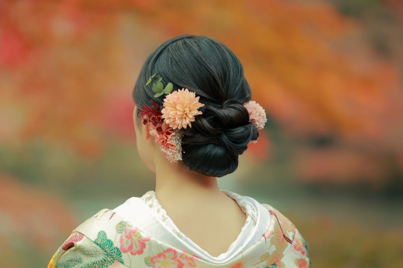 すっきりタイトにまとめた和装ヘアから、やわらかく動きのあるスタイルへと変えることで、180度ガラッと