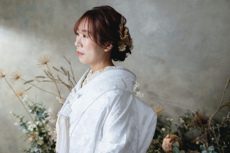 髪飾りは小物コーディネートに合わせてドライフラワーでベージュやゴールド!