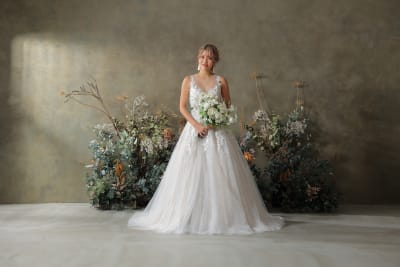 ドレスはピンクベージュのAラインのドレスに王道な白ブーケを合わせました。