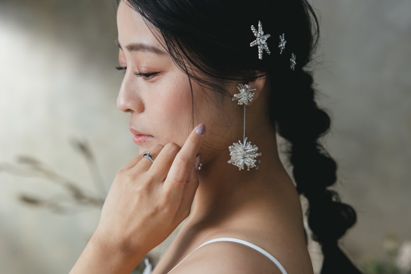 イヤリングを大きめで選び、ヘッドアクセはシンプルにまとめました。