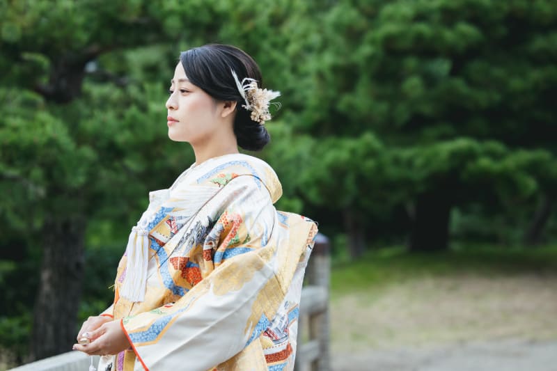 ご新婦様はベージュ系の着物で柔らかい雰囲気に。