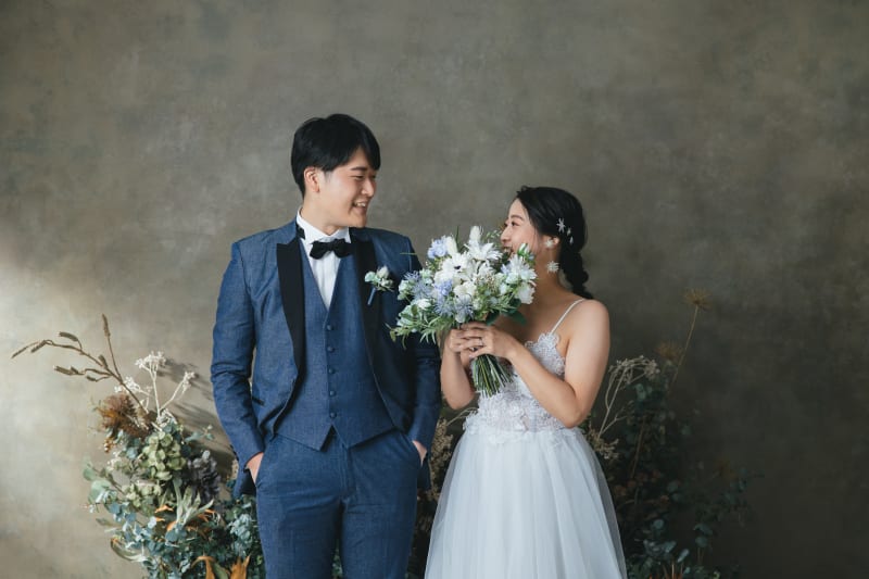 ご新郎様は、ご新婦様の衣装の色味に合わせてブルー系のタキシードを。