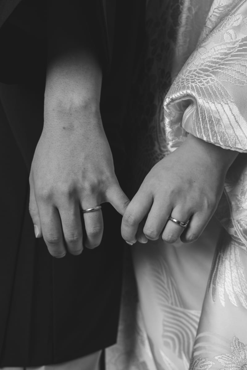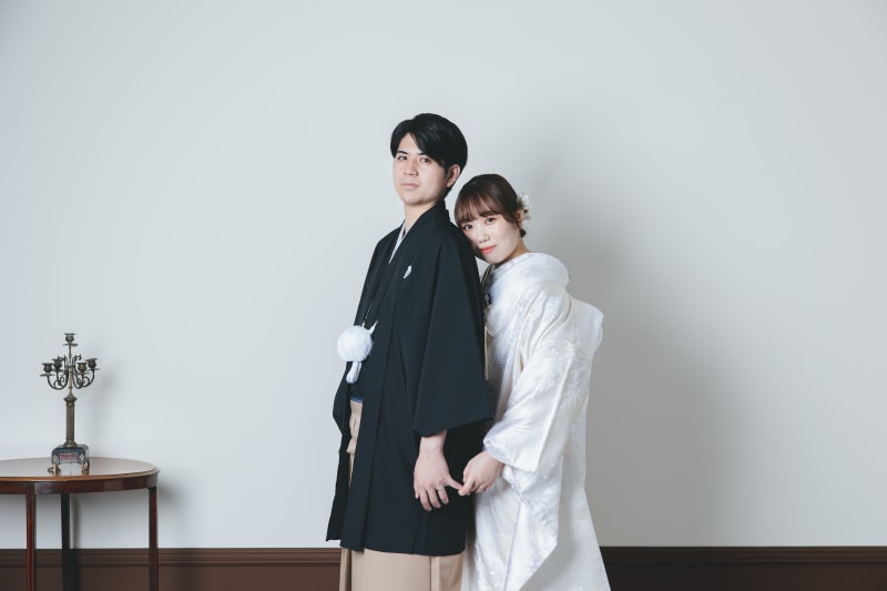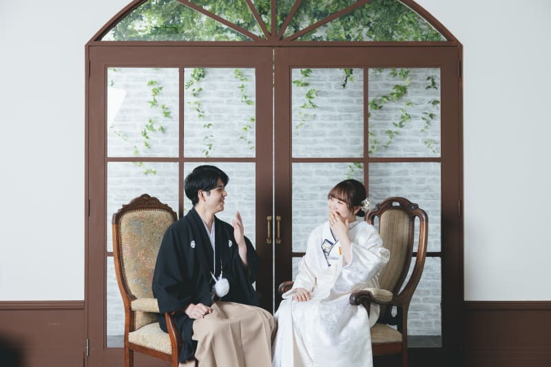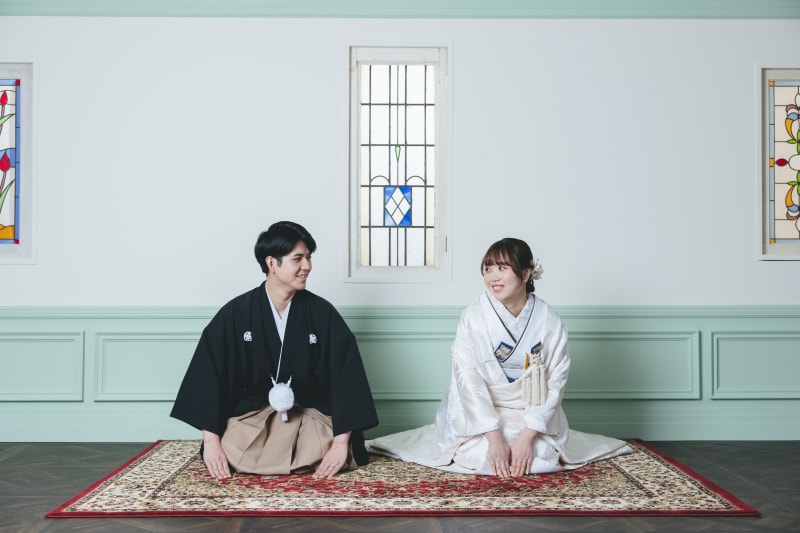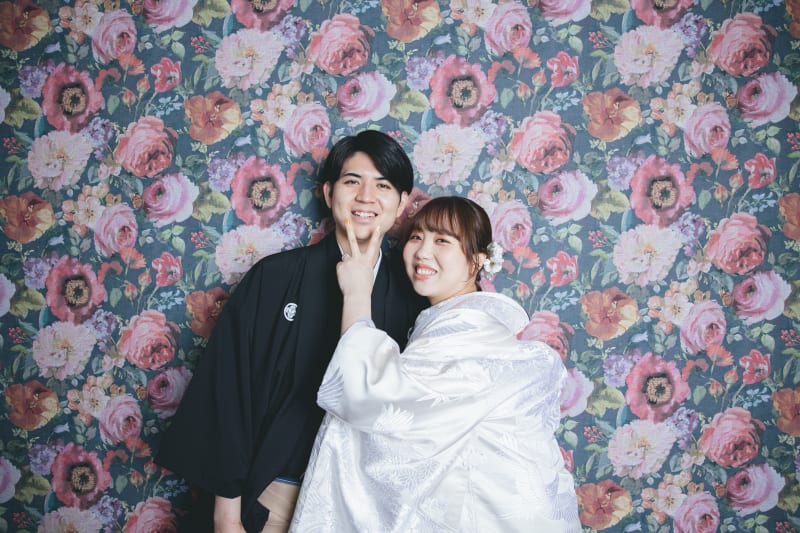 白無垢だとレトロなお花柄の背景にもとても映える!