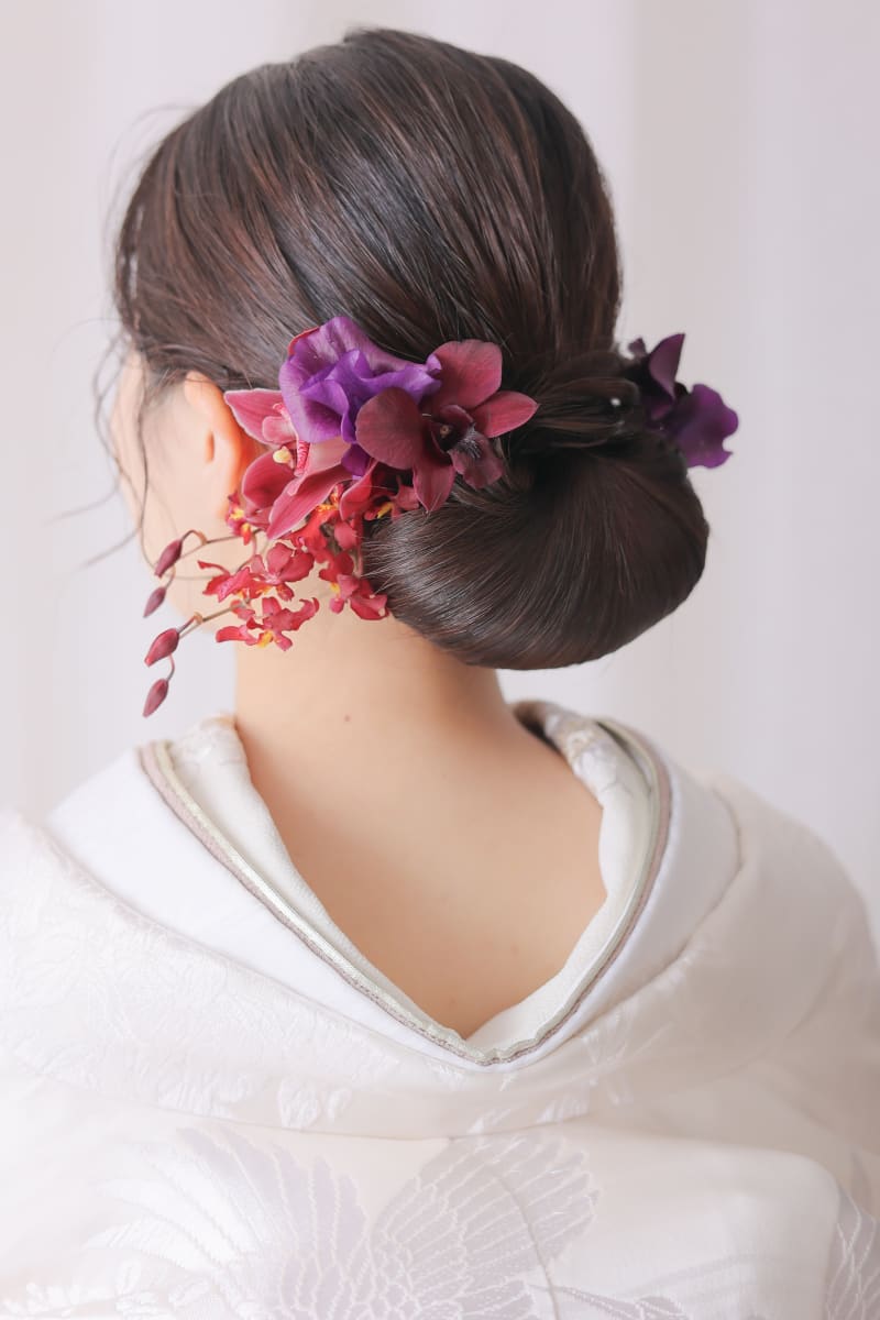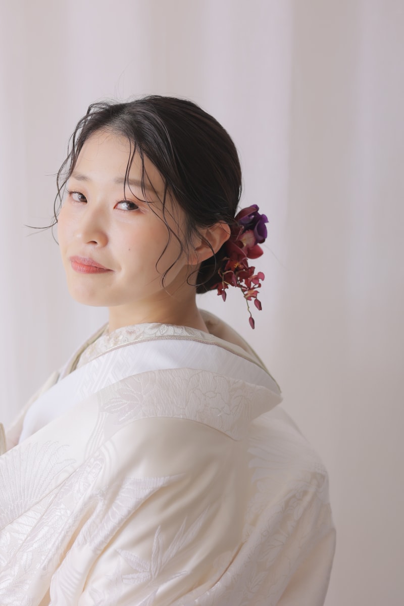 お持ち込みいただいた生花の髪飾りも相性バッチリでした!