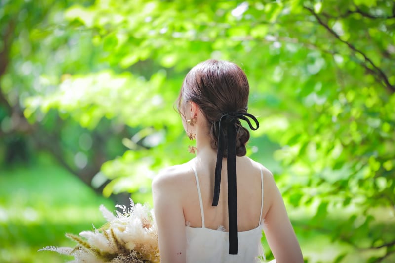 hairはルーズなシニヨンスタイルにお持ち込みいただいたベロアリボンをつけました^^