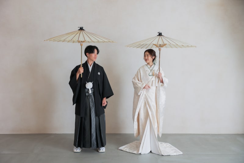 新郎様は黒の紋付にダイヤ柄の袴をご希望いただきました!! かっこいい雰囲気がお好きな方におすすめです!! 新郎様の紋付のお姿とても素敵でした!!