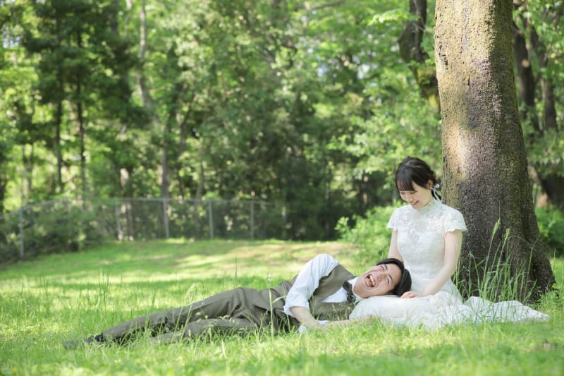 都心から少しはなれた、落ち着いた公園でリラックスしたウェディングフォトを