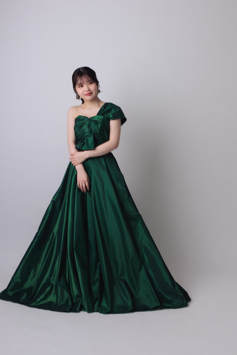 片方のみ袖のあるカラードレスでサテンの生地でボリュームのあるカラードレスです。