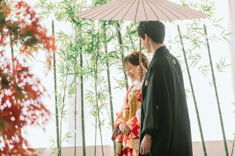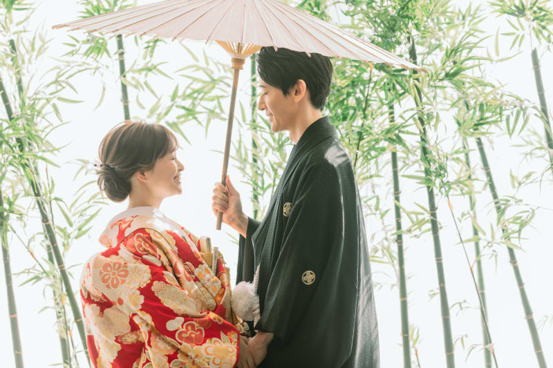 竹林の前でのお写真はとっても涼しげで爽やかな印象に。
