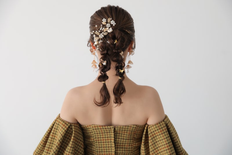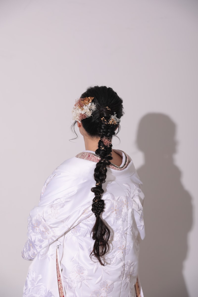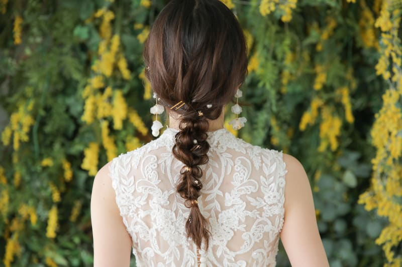 同じような編みおろしでも髪飾りでガラッと印象が変わるので新婦様一人一人の個性を出せます。