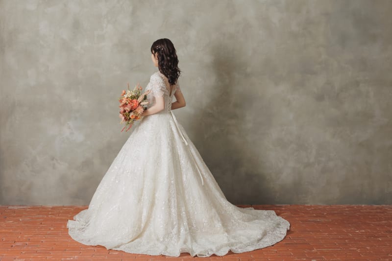 スタジオでの撮影は、いまとても注目されているAurumのドレスをお選びいただきました。