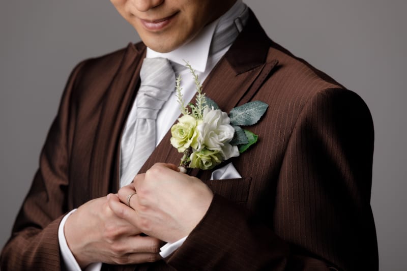 ご新郎様の胸元を飾る花飾りと指輪。表情が映ってないからこそより魅力的に映る瞬間もあります。